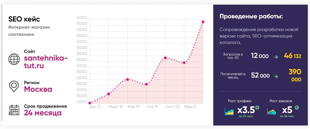 Не верьте на слово. Посмотрите пример работы SEO компании по продвижению одного из сайтов в течение 24 месяцев. Увеличение органического трафика для компании продающей сантехнику в 3,5 раза, рост заказов в 5 раз. Продвижением занималась Digital-агентство DotWorks.