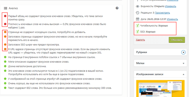 Для выполнения перечисленных выше правил, я использую отличного помощника плагин Yoast SEO WordPress, который быстро и легко позволяет эти и многие другие правила оптимизации проверять.
