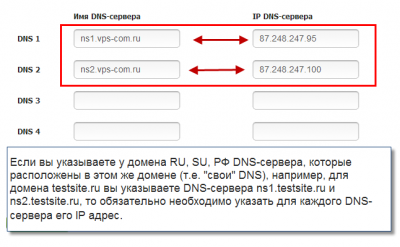 Важно! При смене доменных зон у регистратора, домен который используется для создания своих DNS, прописывается с указанием IP адресов сервера. На фото меняются DNS сервера для домена vpc-cоm.ru, который используется на сервере для создания своих DNS серверов. Как видите, нужно указать не только Имя DNS-сервера, но и IP адреса DNS-серверов. Для других доменов IP адреса указывать не нужно.